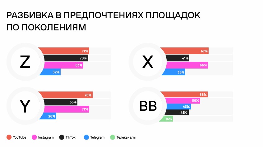 Зумеры больше ценят креативные шоу, миллениалы — образовательные проекты, бумеры — кейсы и конкурсы.