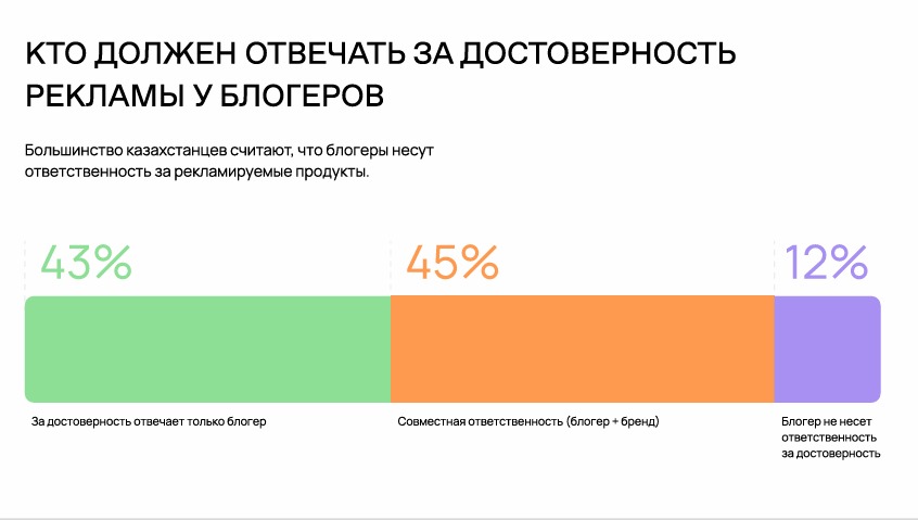 Большинство казахстанцев убеждены, что блогеры несут ответственность за рекламируемую продукцию у себя на страницах. 43% жителей Казахстана уверены, что именно блогер обязан следить за достоверностью информации. Еще 45% считают, что ответственность должна быть совместной — и блогера, и бренда. Об этом стало известно из исследования* медиапотребления, проведённого коммуникационным агентством Пиархаб Центральная Азия совместно с казахстанской исследовательской компанией Alvin Market и компанией специализированных сервисов и технологий digital-маркетинга Go Ahead KZ.