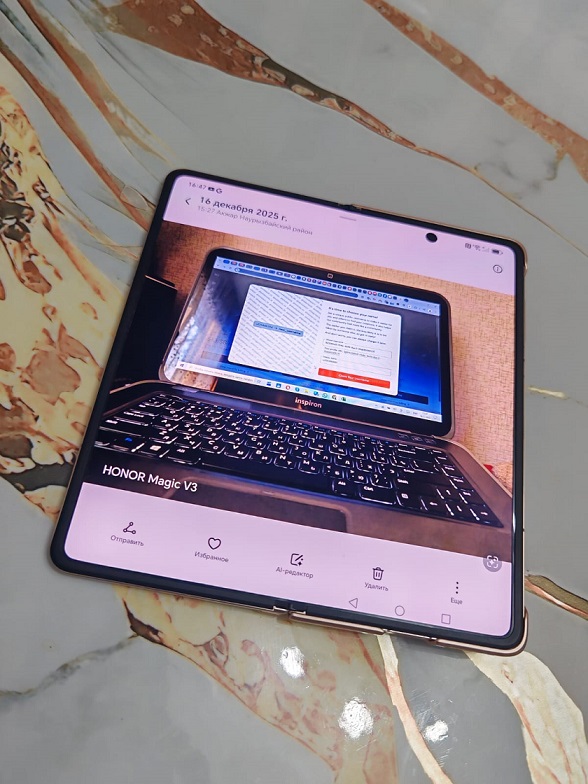HONOR Magic V5 защищен от пыли и влаги по стандартам IP58 и IP59. При использовании смартфона складывается впечатление продуманности и высокого качества. В сложенном состоянии зазоры минимальны, в разложенном состоянии сгиб экрана еле заметен. В коробке идет очень удобный чехол с кольцом вокруг блока камер, которое также является и ножкой-подставкой, при чем ей удобно пользоваться в обоих состояниях смартфона.